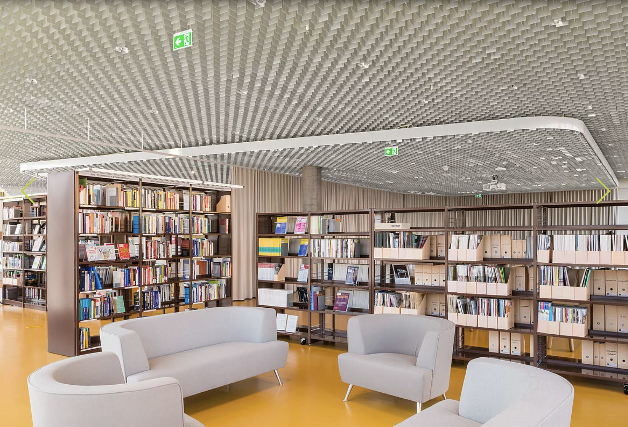 – Dissimulation technique élégante : le plafond alvéolaire permet de masquer sprinklage, aération et autres installations tout en conservant une lecture claire de l’espace, participant à une perception fluide et soignée du volume.