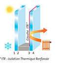 • Le facteur solaire, comparé à celui d’un double vitrage habituel, est de 2 points plus élevé (0,65 contre 0,63), et même 5 points plus élevé (0,63 contre 0,58) si le verre à couche est le verre extérieur du double vitrage. Ce qui signifie plus d’entrées de chaleur solaires gratuites.